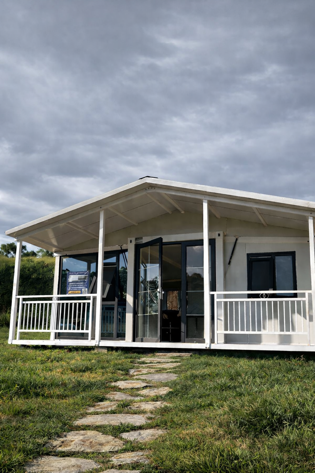 Cabaña Alpina con extención de terraza acabados incluidos bajo el modelo Llave en mano, incluye cimentación básica o flotado, instalaciones eléctricas, sanitarias e hidráulicas ocultas, cancelería en aluminio, piso cerámico, acabado interno en microcemento, así como el exterior en la parte trasera.